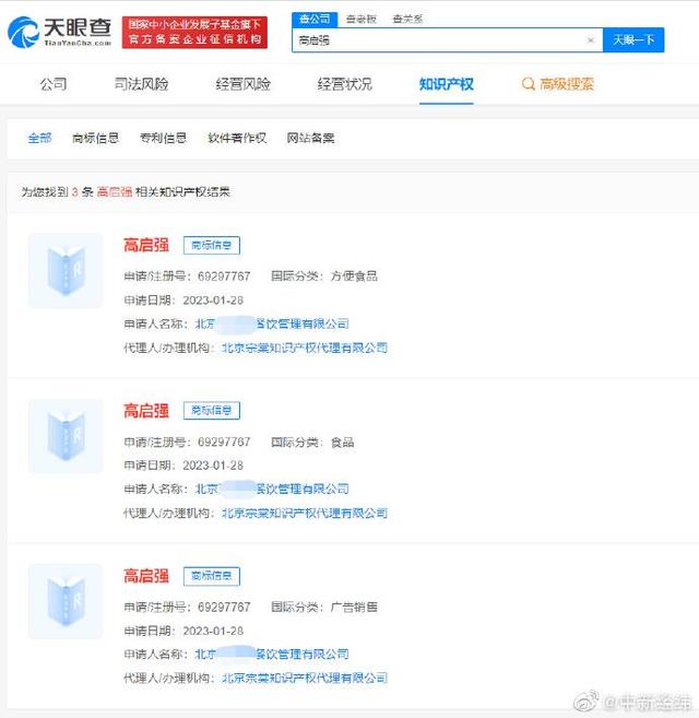 近日,爆火电视剧《狂飙》迎来大结局。网传视频显示,有粉丝等待高启强的扮演者张颂文并为其送花、索要签名。天眼查App显示,近日,“高启强”被申请注册商标,申请人为北京一餐饮管理公司,国际分类涉及广告销售、食品、方便食品,当前商标状态均为申请中。